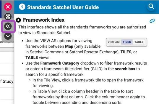 You can now easily dock the user guides to the left or right of your screen depending on your preferences or what you are trying to access within Satchel. Simply click the double arrows icon.